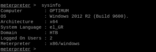 If we look closely, we can see that something's not right here. Optimum's architecture is x64. Our meterpreter version is set to x86, not x86_64! If we are going to proceed, we are going to need to change this.