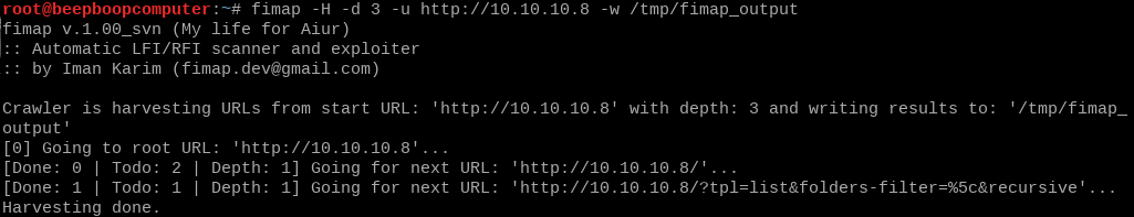 We can just run fimap -H -d 3 -u http://10.10.10.8 -w /tmp/fimap_output
