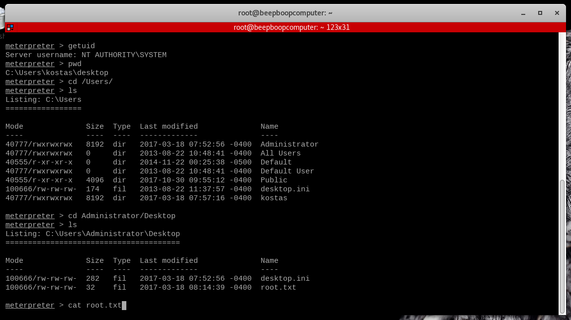 getuid- should output NT AUTHORITY\SYSTEM. This is Windows-Speak for "All-Powerful Admin Root Master"pwd- see where we are and how we can navigate to the admin's desktop.cd /Users/ls- from here we can see all the User directories, including Administrator.cd Administrator/Desktop- we know this is where our flag can be found.lscat root.txt- system flag captured!