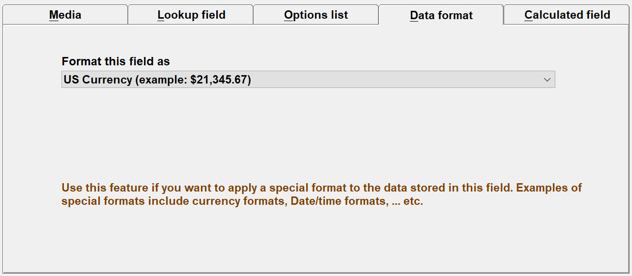C:\Program Files\AppGini\add-ons\dataFormats.cfgfile, as the context help suggests. However, this is not a very user-friendly approach.A much easier way to add currency symbols is to use the CSS