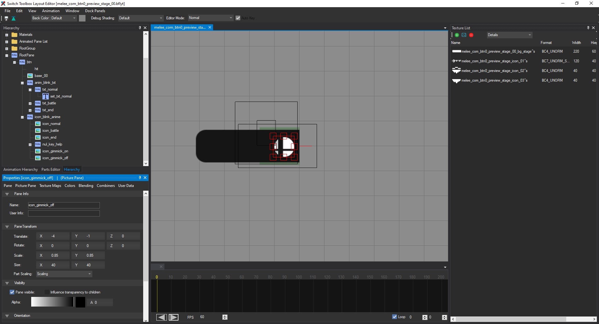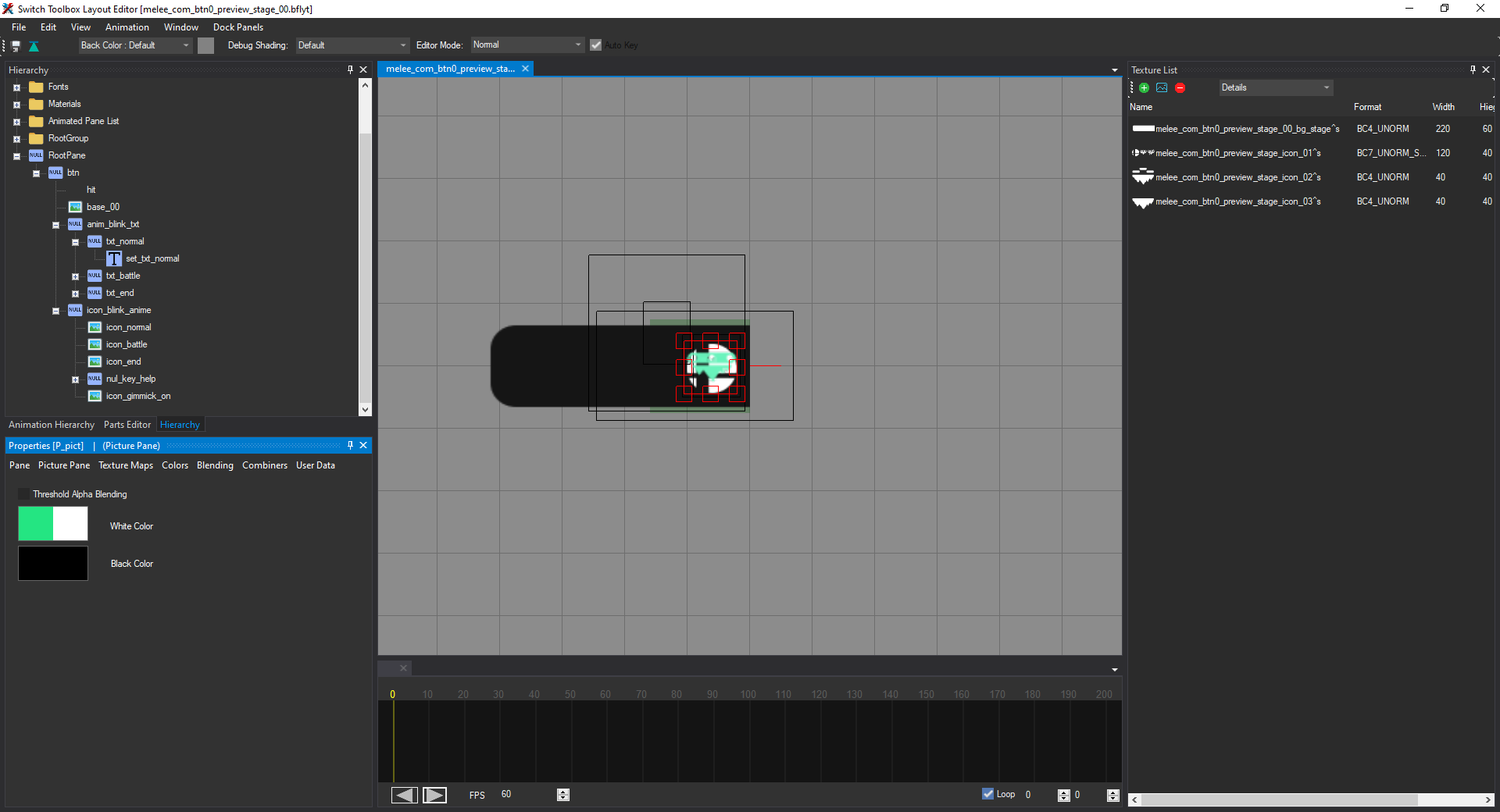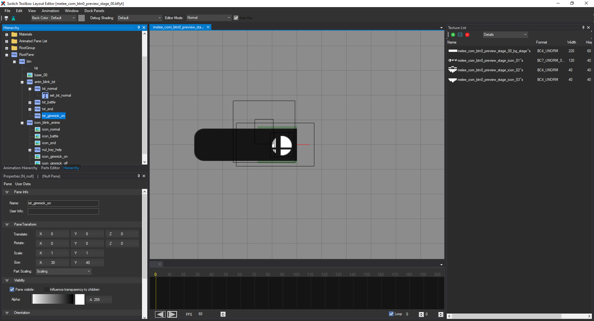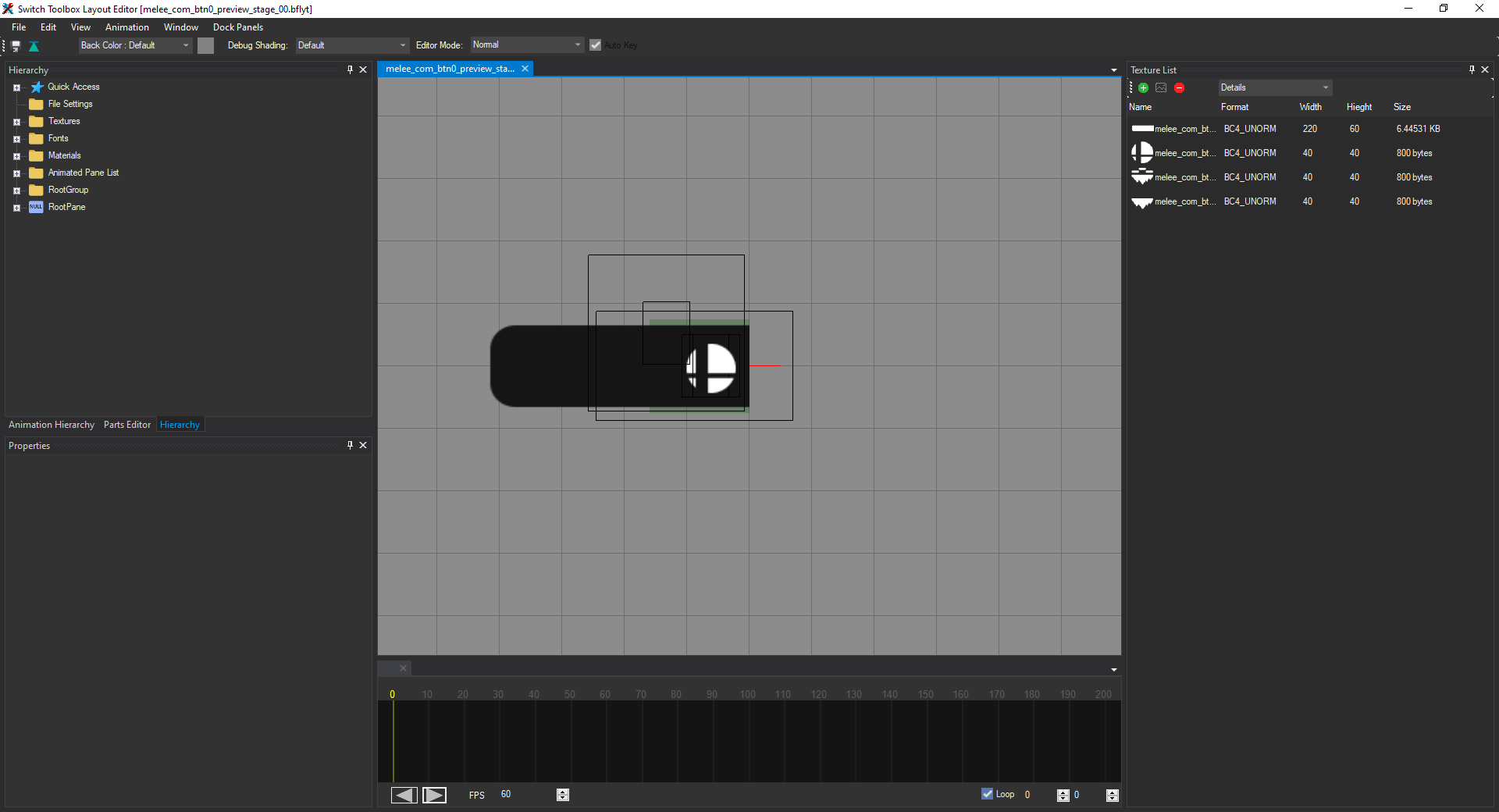 Open the file named melee_com_btn0_preview_stage_00.bflyt in the layout listing. Once it's opened in the layout editor, it should look like this: