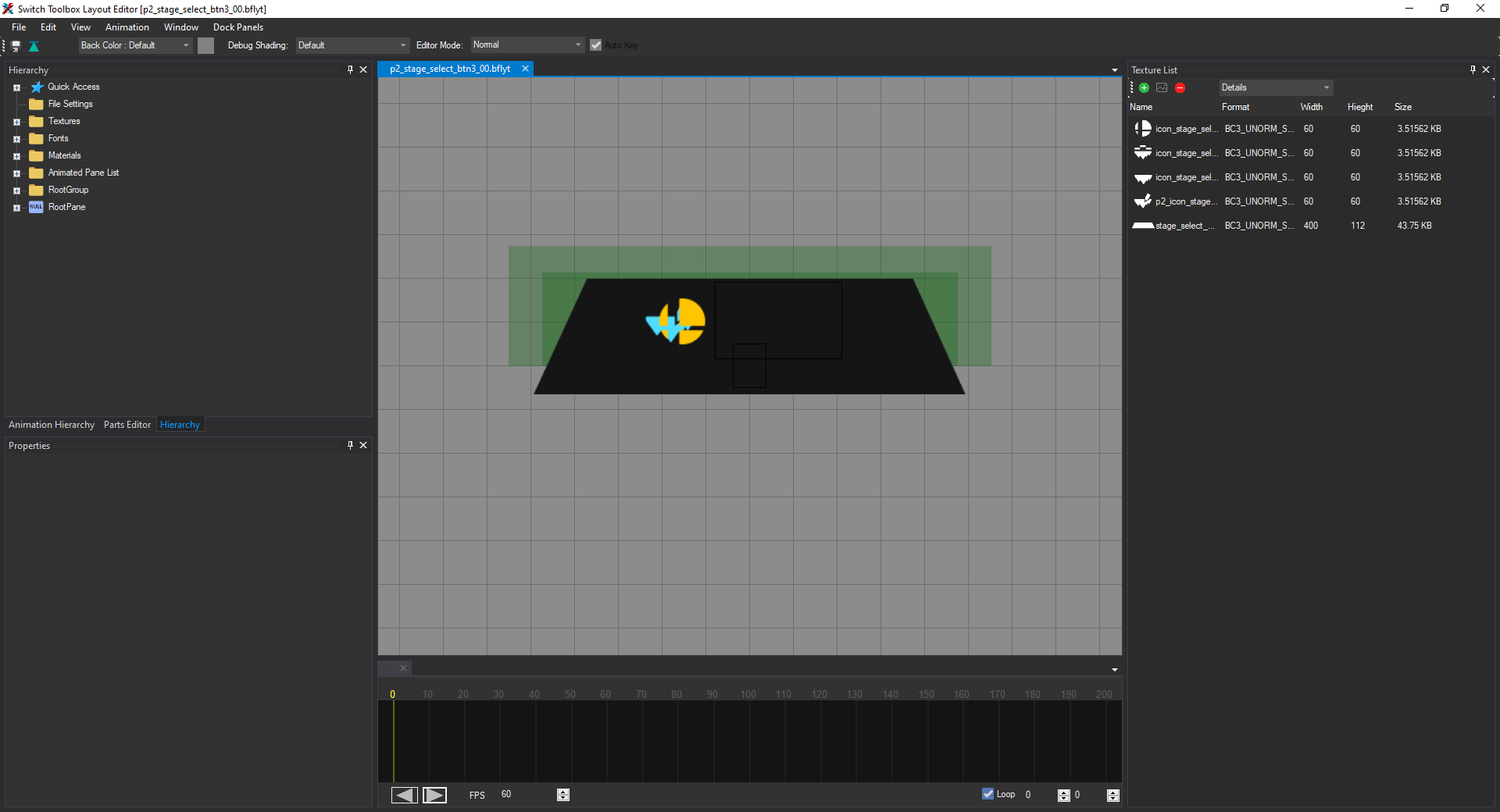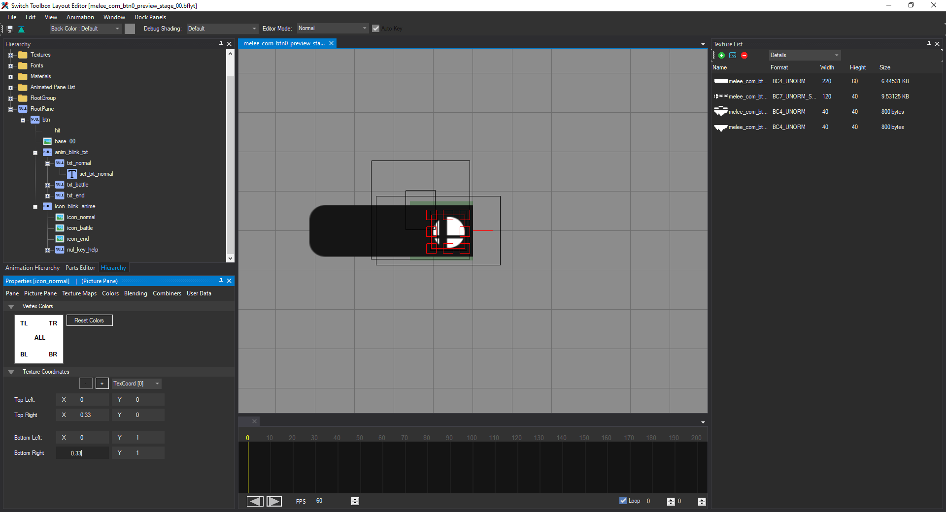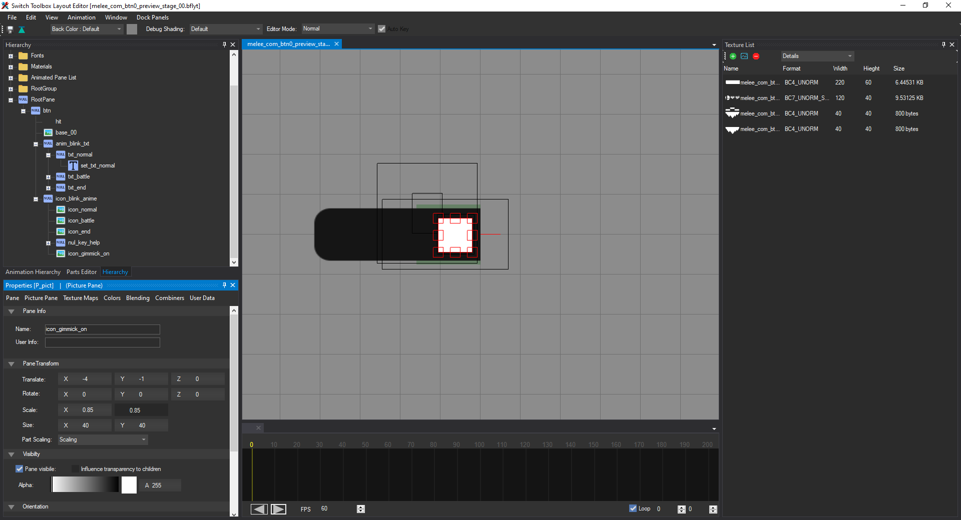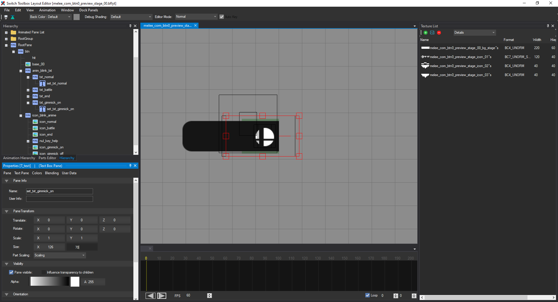 Open the file named melee_com_btn0_preview_stage_00.bflyt in the layout listing. Once it's opened in the layout editor, it should look like this: