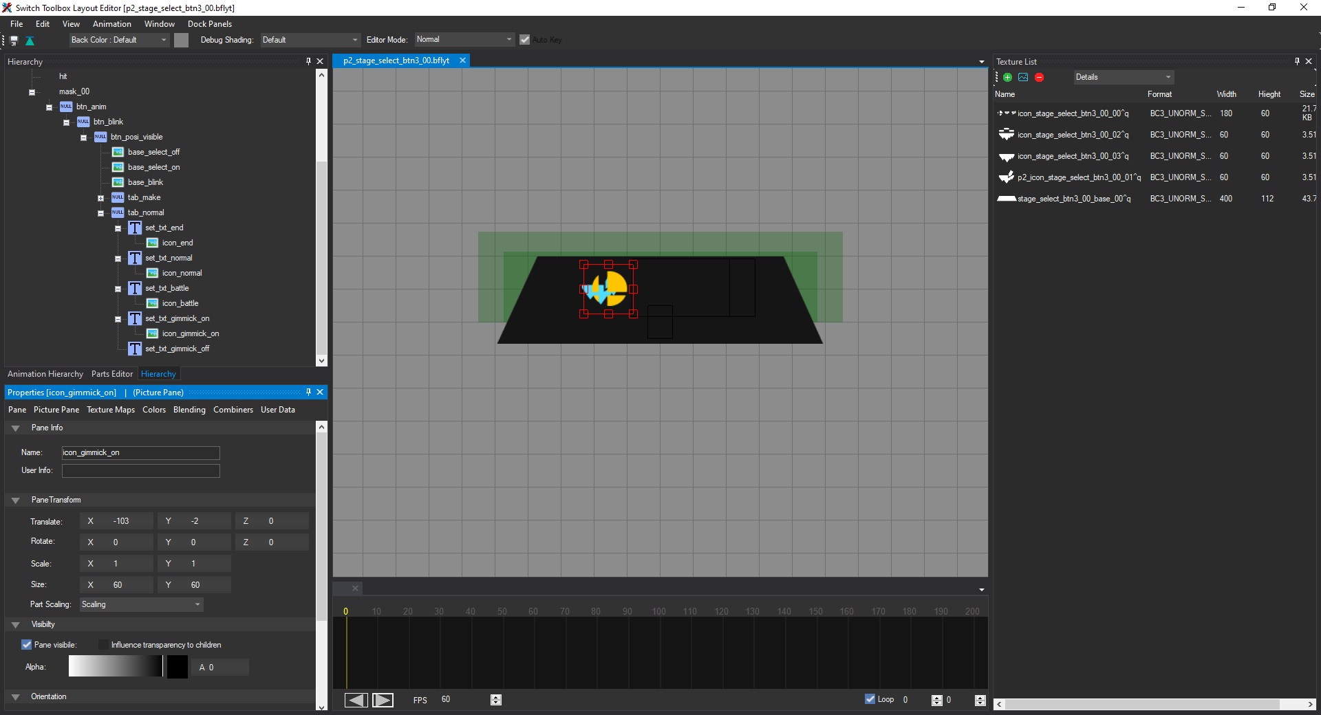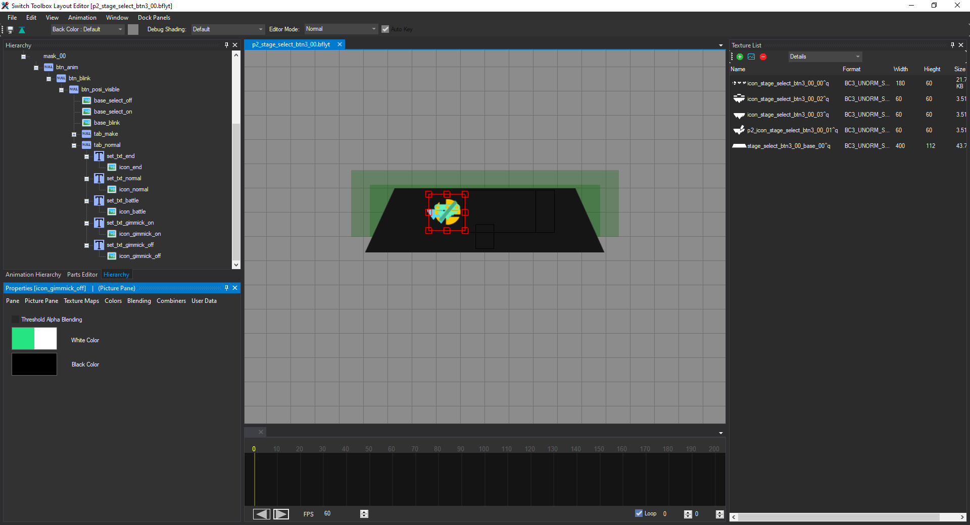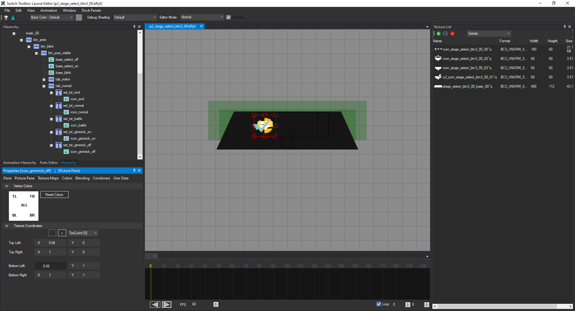 Go to the Texture Maps tab for icon_gimmick_on, click Add under Textures, and select icon_stage_select_btn3_00_00^q. It should look compressed like we've seen before. Under Picture Pane, change the left X coordinates to 0.33 and the right X coordinates to 0.66: