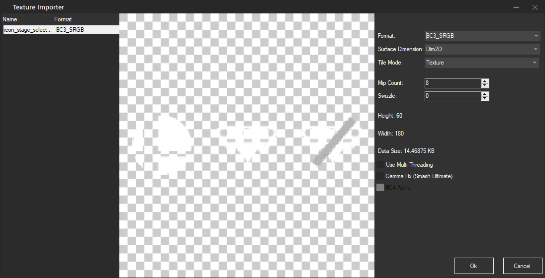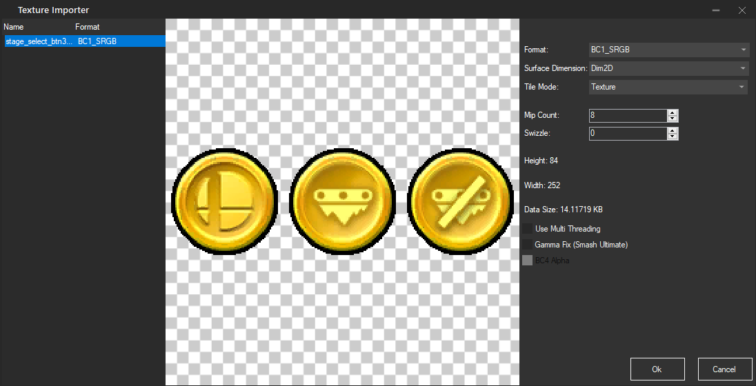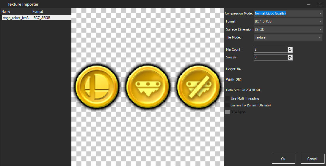 Right click on the regular smashball icon in the Texture List and replace it with preview.png. Change the format to BC7_SRGB, which is not the same as what we are replacing but it won't cause any problems. Make sure the quality is Normal (Good Quality) and then click ok: