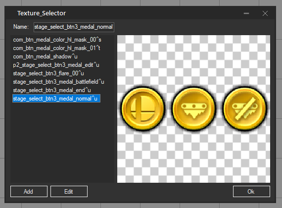 Click the Add button and it should open up a texture selector menu. You want to select the texture for the normal medal, so pick stage_select_btn3_medal_normal^u: