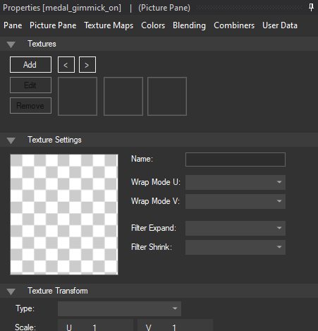 Now we are going to start making the hazards on medal. First, click on the medal_gimmick_on pane in the pane hierarchy. It will populate the Properties tab in the bottom left. Click on the Texture Maps tab inside of the Properties and you should see this: