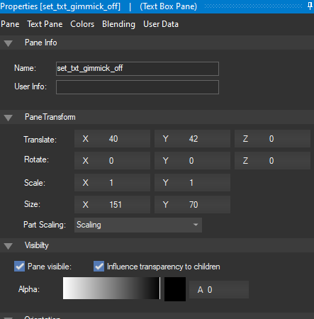 Now that both panes have been created, all that is left is to map them to a texture. Before we do that, we want to set the alpha of medal_gimmick_off to 0, so that we can see the medal_gimmick_on pane that we are working with. Go ahead and click on the medal_gimmick_off pane in the pane hierarchy so that it populates the Properties tab. Click on the Pane tab, scroll down and drag the alpha slide all the way to the right so it is 0:
