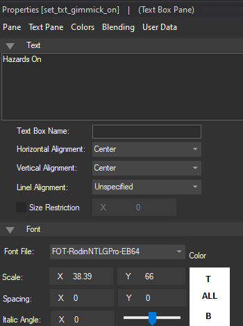 Create a new Textbox Pane named set_txt_gimmick_on and set its text to Hazards On. Drag it under txt_gimmick_on on the pane hierarchy. Set it's position to X: -7 and Y: 0 and the size to X: 126 and Y: 70: