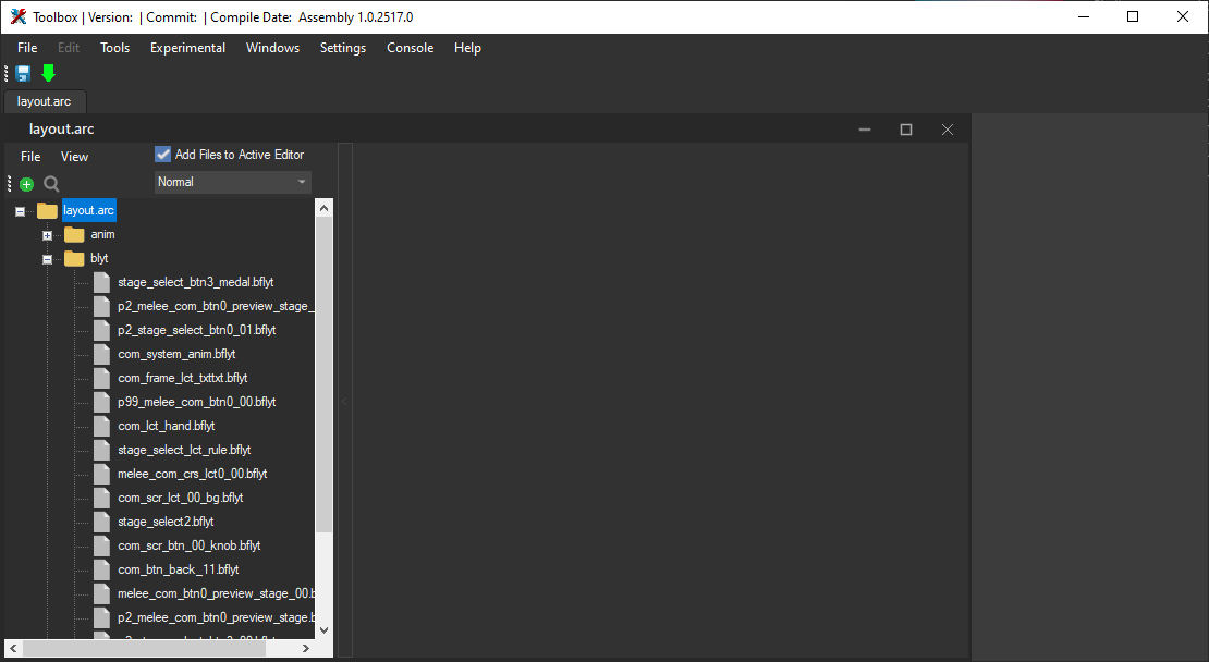 We are only going to be working inside of the raw layouts, so click the + button to the left of layout.arc, and then the + button to the left of blyt to expand a listing of all of the layouts. Once you've done that, it should look like this: