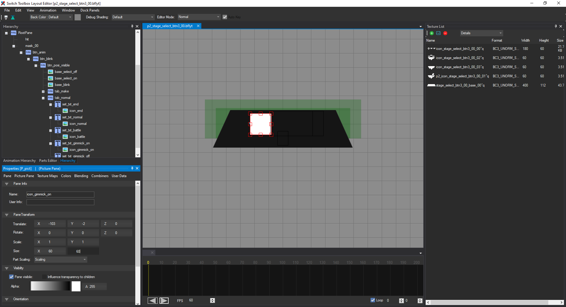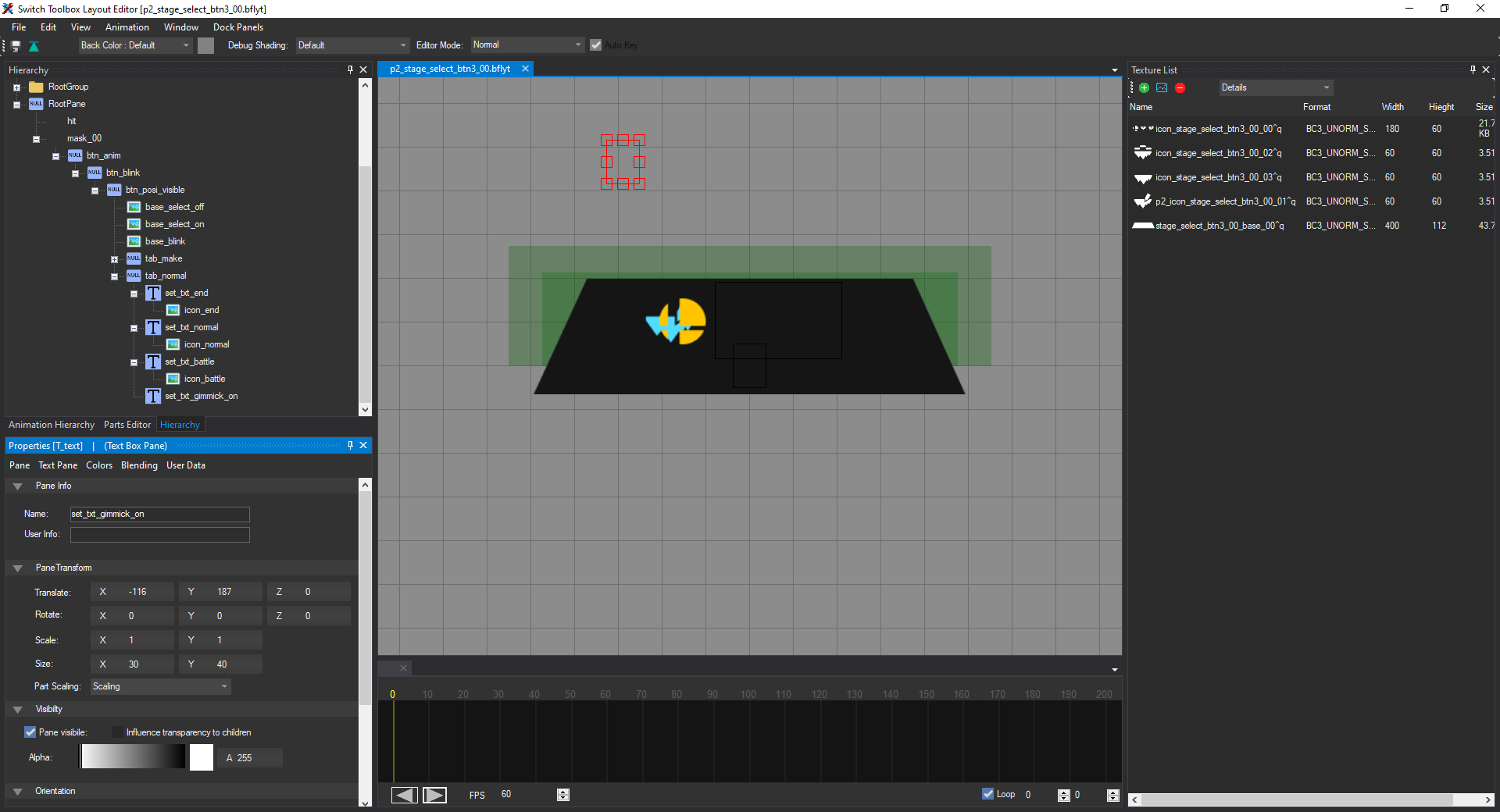 Open the file named p2_stage_select_btn3_00.bflyt in the layout listing. Once it's opened in the layout editor, it should look like this: