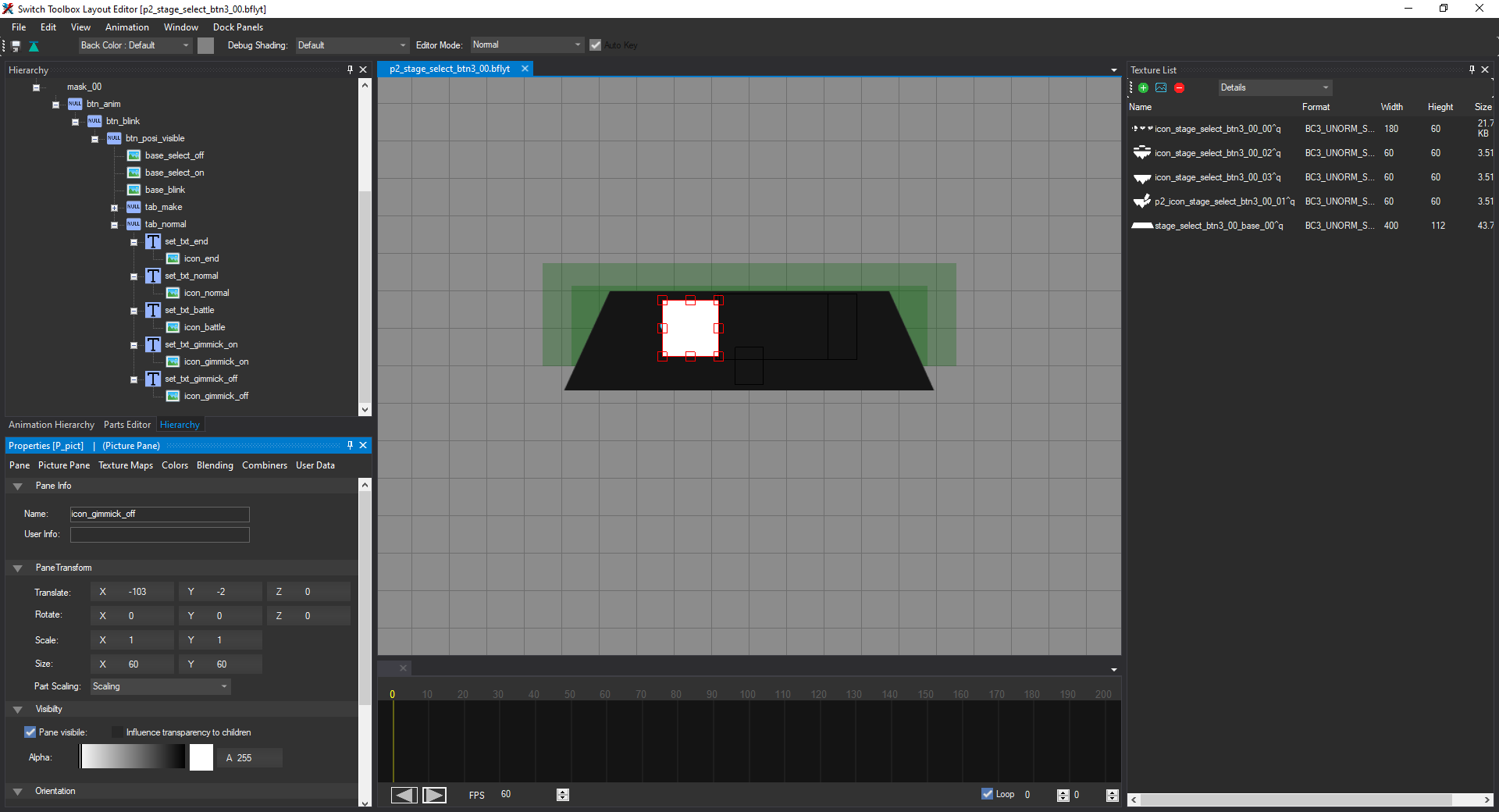 Create a new Picture Pane and drag it under set_txt_gimmick_on in the pane hierarchy. Set the size to X: 60 and Y: 60, the translation to X: -103 and Y: -2, and the name to icon_gimmick_on: