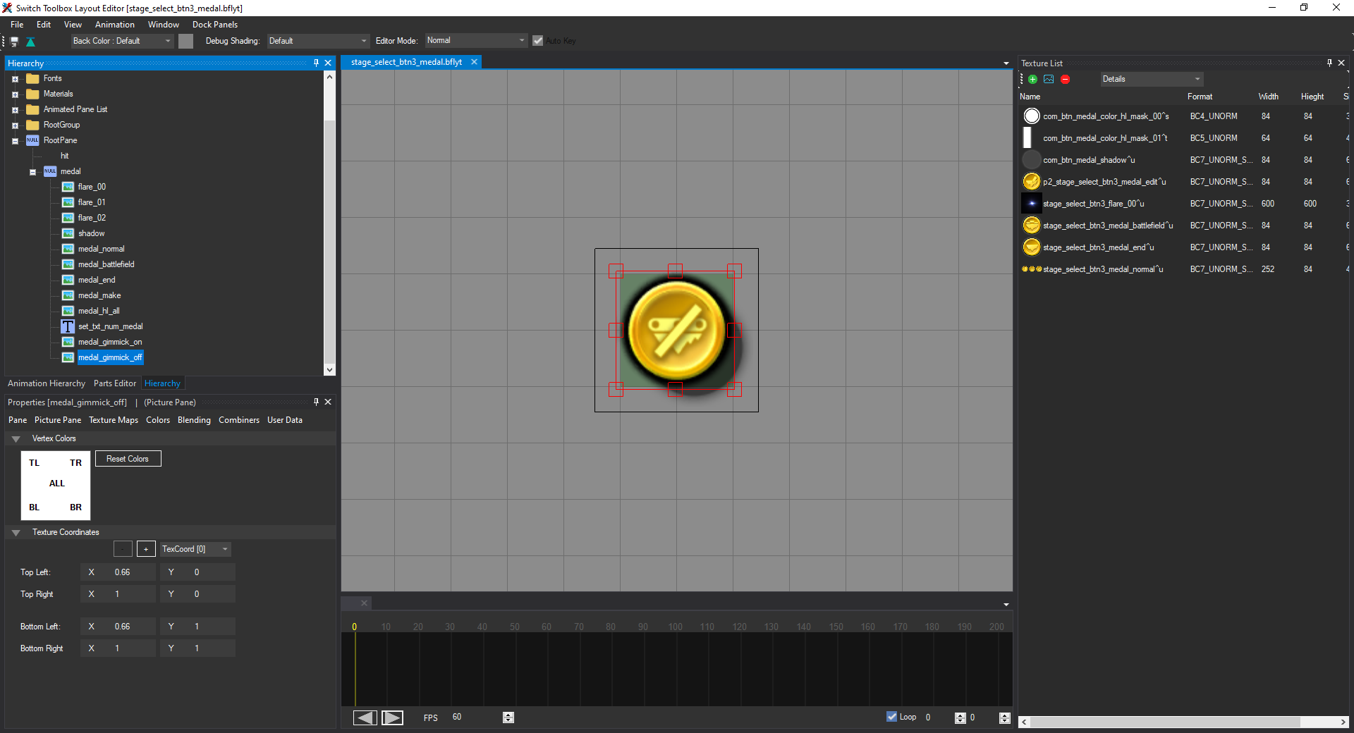 Once you are done, set the Alpha of both medal_gimmick_on and medal_gimmick_off to 0, and then click the Save icon in the top left to save the layout. Then close the window so you are back in STB's main listing.