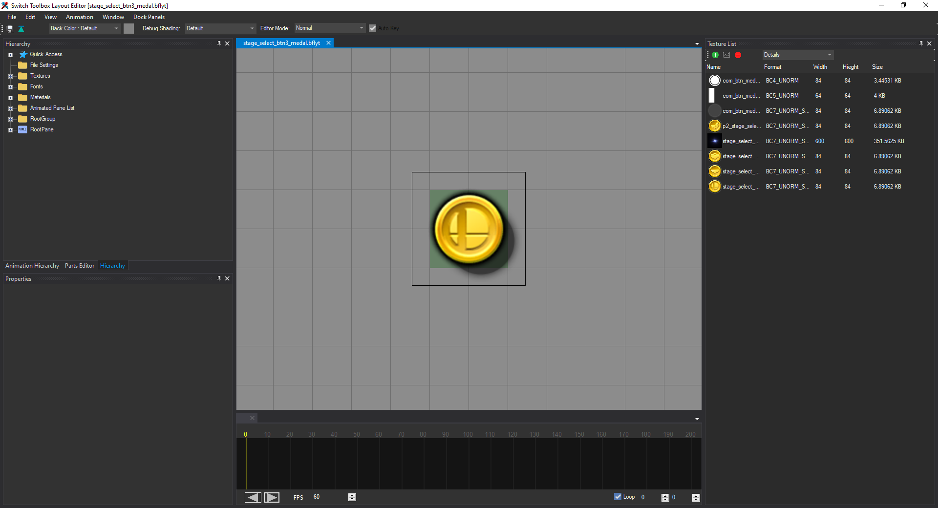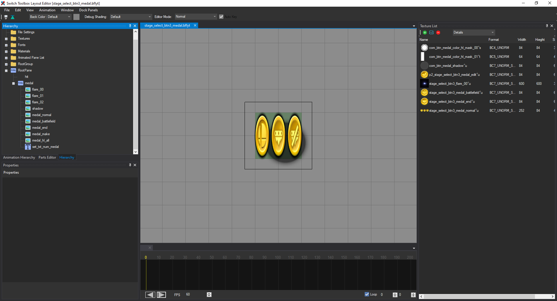 In order to fix this, we need to go to the Hierarchy tab on the left side of the window. It should display a list of expandable sections. We want to expand RootPane, then medal. You'll see a list of panes with names like flare_00, medal_normal, medal_battlefield, shadow, etc. (not in that order). Your window should now look like this: