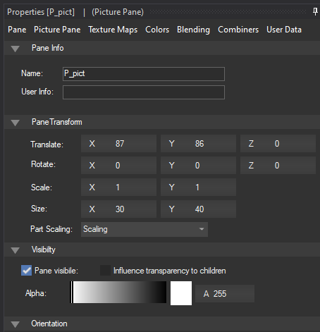Next, click on your white pane so that it populates the Properties tab in the bottom left, then switch to the Pane tab from within that. It should look something like this, however your Translate coordinates might be different: