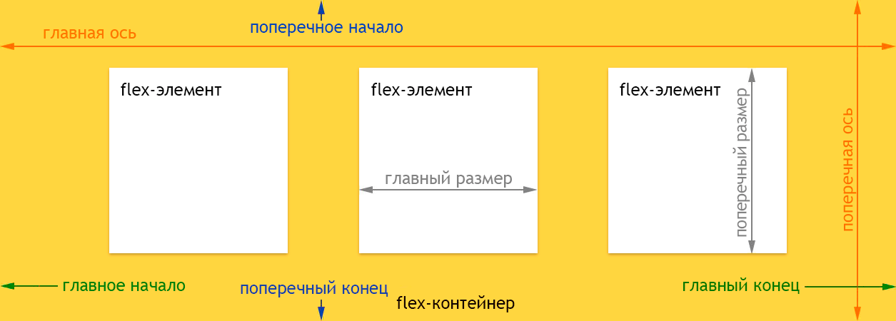 Flex-раскладка состоит из родительского контейнера, именуемого flex-контейнером, и его непосредственных дочерних элементов – flex-элементов.