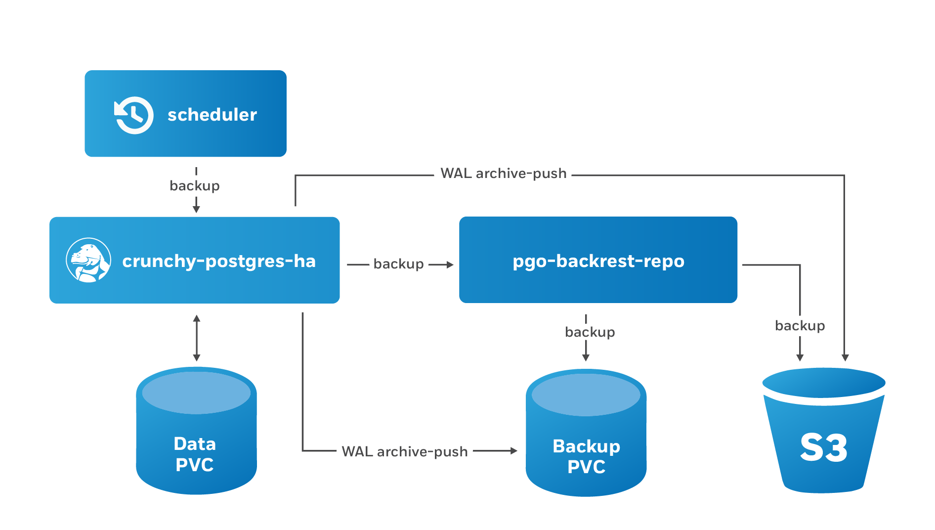 The PostgreSQL Operator supports creating backups in S3 or any object storage system that uses the S3 protocol. For more information, please read the section on PostgreSQL Operator Backups with S3 in the architecture section.