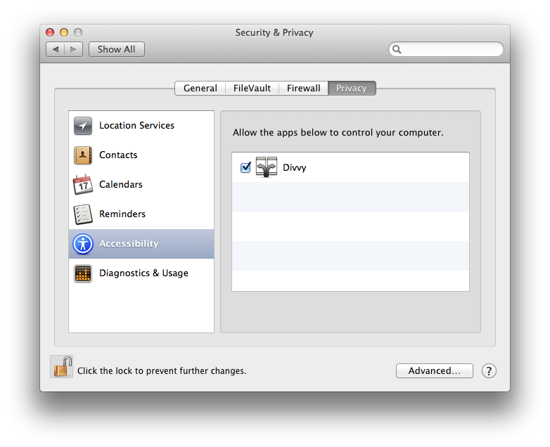 At the time of this writing Divvy hasn't been updated for OS X 10.9 so it tries to direct you to the Accessibility panel of the System Preferences. Actually the assistive device settings have been moved to the Security pane as shown below: