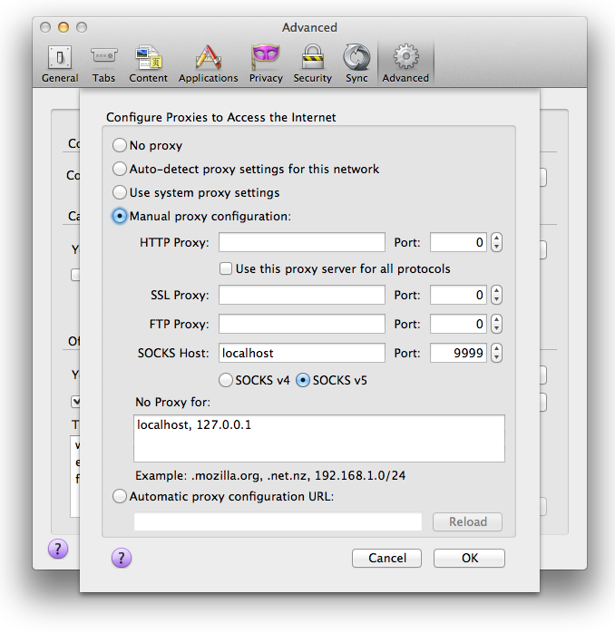 $ ssh -N -D 9999 yourserver.comThen setup your browser to use a SOCKS proxy: