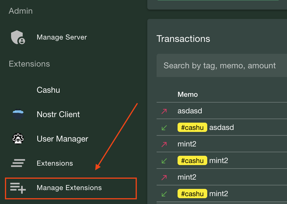 Now, when you restart LNbits again, you'll notice that this user is now an admin and can install extensions in the "Manage Extensions" menu. Here is a more detailed guide how you can proceed from here.