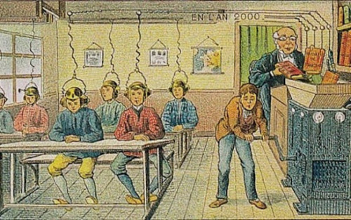 Villemard's 1910 prediction of what schools would be like in 2000. Lessons would be digitally uploaded into children’s brains. But there is still a teacher. There are still desks. And the machine is powered by a hand crank.