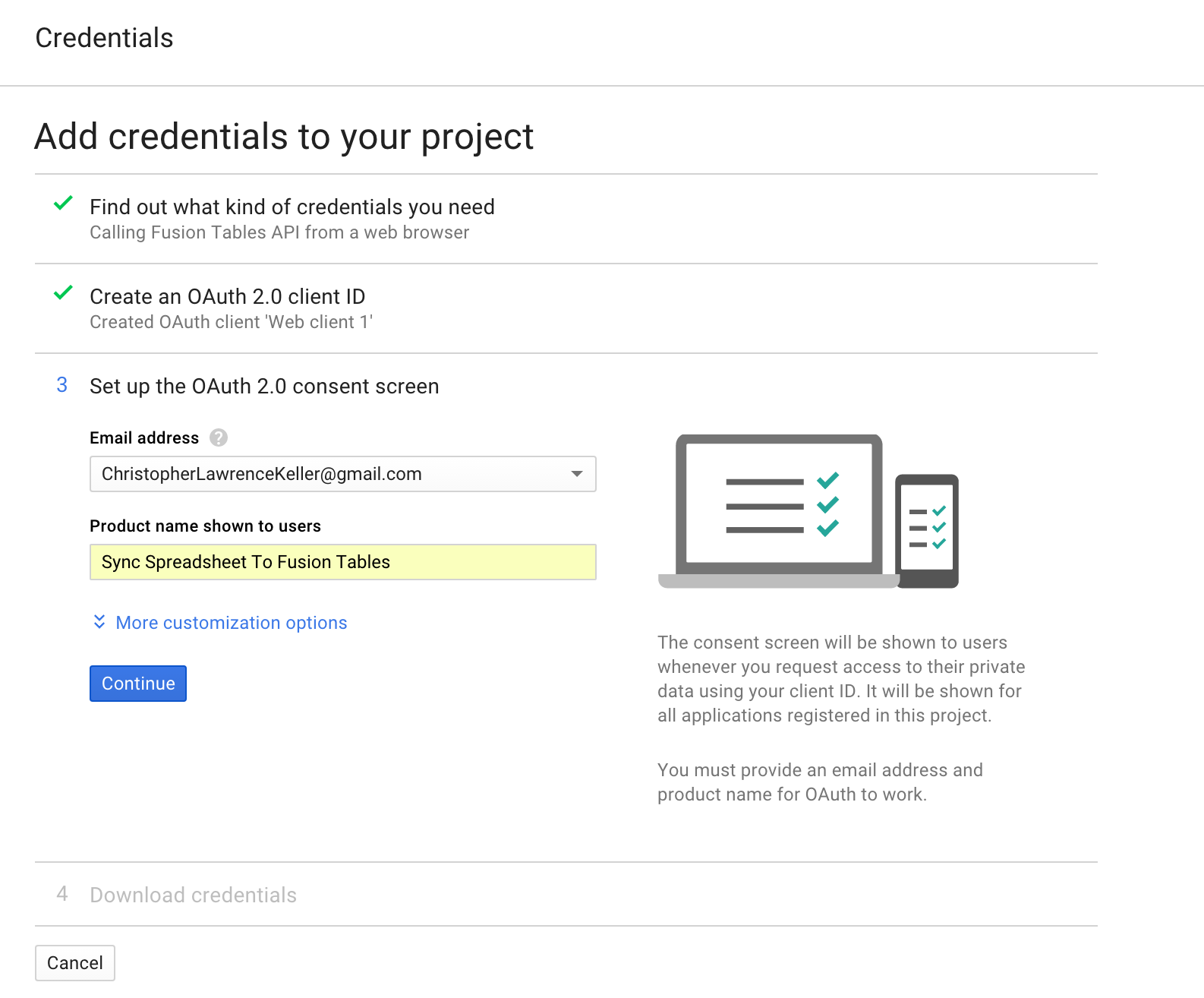 For Product name shown to users I put "Sync Spreadsheet To Fusion Tables"