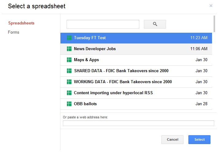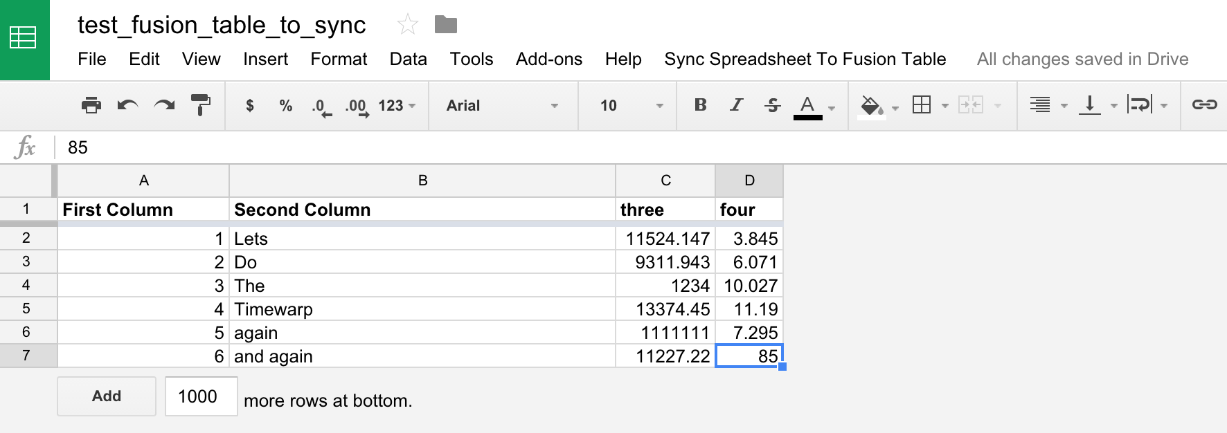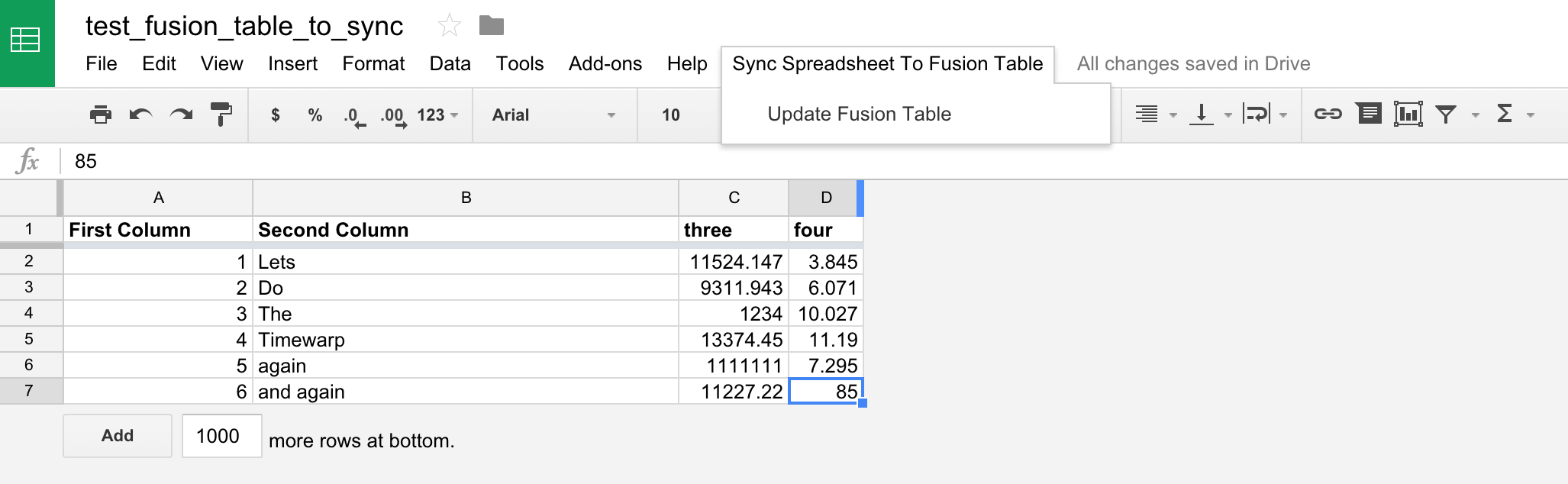 This script can now be combined with other script functions to make the integration between Google spreadsheets and Fusion Tables more powerful. Or perhaps you want to add a trigger to sync data between the spreadsheet and the table. Such a trigger can be added to run minute by minute, or hourly and those changes will be reflected on the table.