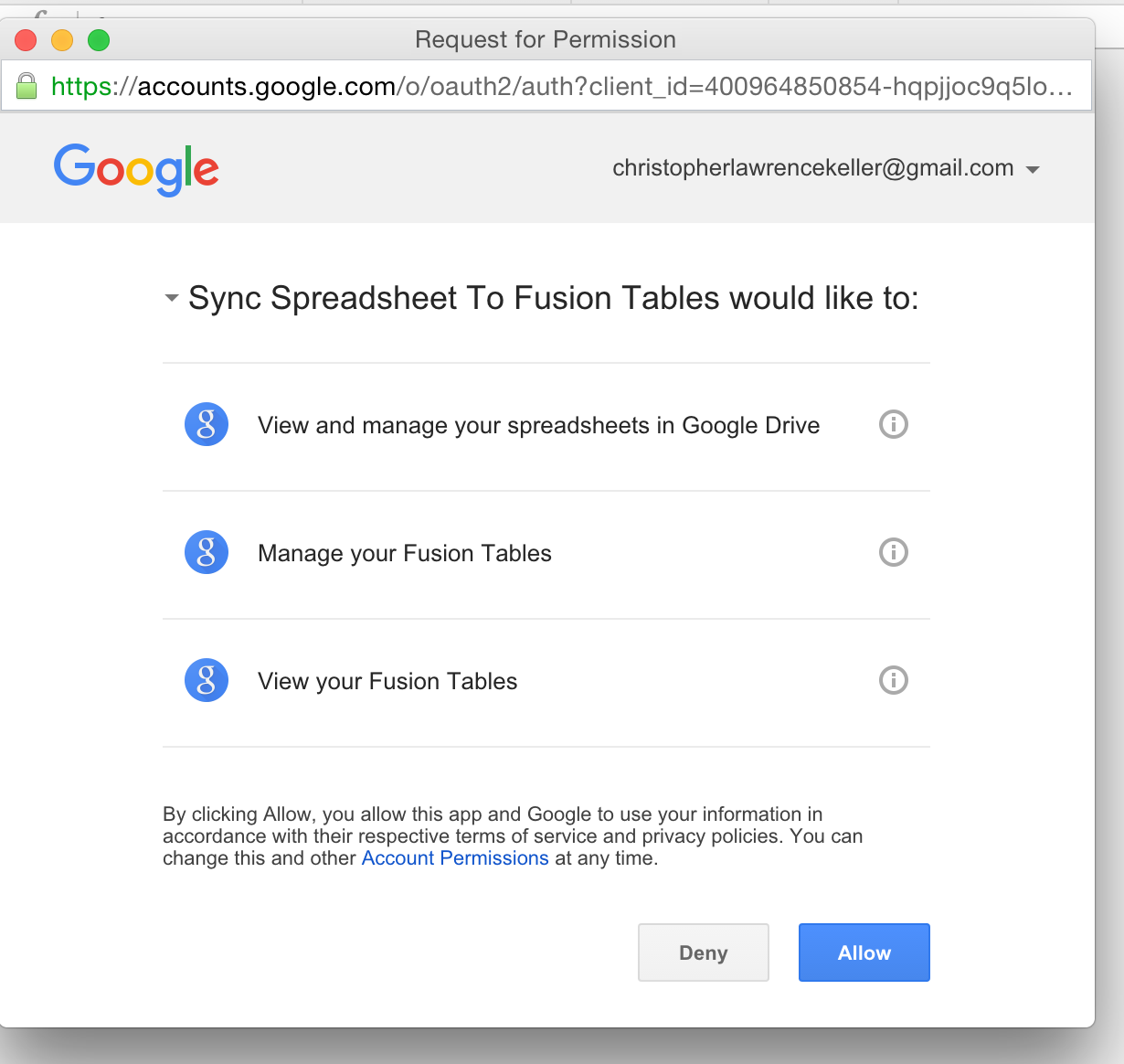 Save for a few legacy projects that still use Fusion Tables I don't actively use this script anymore. This update hopefully solves the OAuth issue that cropped up once Google depcricated the Client Login method used by the prior version.