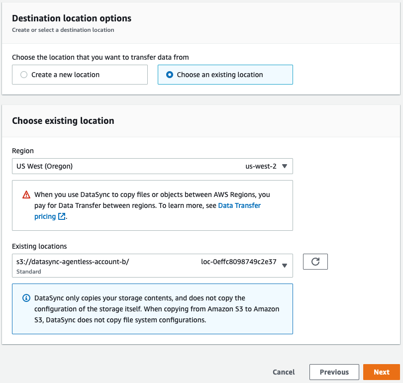 aws datasync create-location-s3 --s3-bucket-arn arn:aws:s3:::destination --s3-config '{"BucketAccessRoleArn":"arn:aws:iam::1234567890:role/Datasync-destination-role"}'
