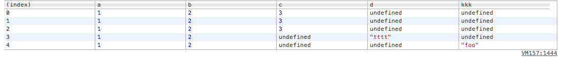 > var myArray = [{a:1, b:2, c:3}, {a:1, b:2, c:3}, {a:1, b:2, c:3}, {a:1, b:2, d:'tttt'}, {a:1, b:2, kkk:'foo'}]