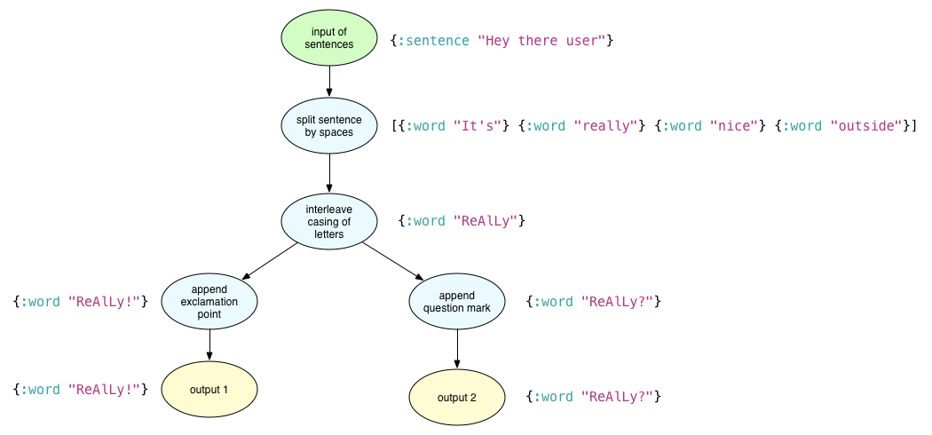 Notice that when we get to the interleaving of case case, we fork the computation into two distinct streams. This demonstrates a fundamental ability of Onyx to model directed, acyclic graphs as trees. Let's add another level of detail and show some actual data passing through each stage: