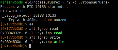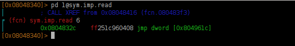 To leak a libc address we'll want to read from the GOT entry of a known libc function. We can see that read is in the GOT at 0x804961c. Write is done as such.