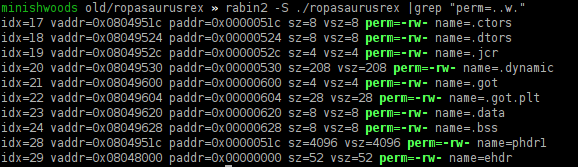 We now need a place to read the string to. ELF has different sections, with different permissions. Some are read only, write only, execute only, or any combination of the three! rabin2 lets us see the secitions and find the permissions and sizes of each, so we can tell where to write to. Imgur Perfect! there are plenty of sections. Generally I like to write to the .bss section, but this is only size 8, which would limit our command. So let's pick the .dynamic section. It is size 208, and we can write to it.