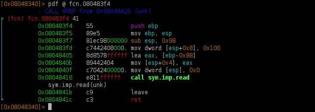 So we see that 0x100 (256) bytes are read in. "buffer" is on the stack size 0x88. This is size 136. We read in 256 bytes on the stack buffer which is only size 136. Great, we found the vulnerability, but don't stop now, Let's get a shell, radare2 has some more tools that can help us with that.