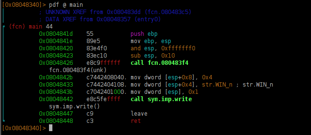 First thing to do, let's see how the binary looks. To disassemble, r2 uses the pd directive. So let's disassemble the main function with pdf @ main
