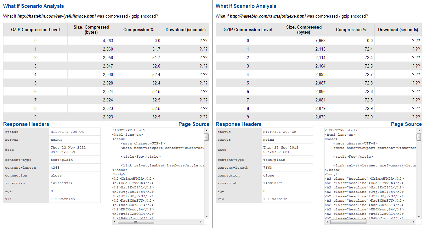 h2elements, each one populated with a totally random string. One file had no classes on the 200h2s, one file hadclass="headeline"on all 200h2s. You can kinda spot this in the screenshot.I then ran them both through a Gzip profiler which told me: