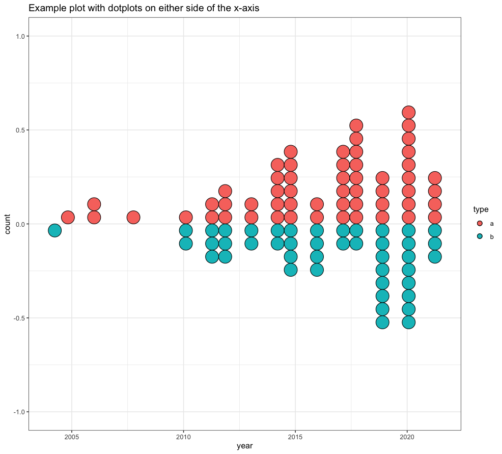 | ggtitle("Example plot with dotplots on either side of the x-axis") |