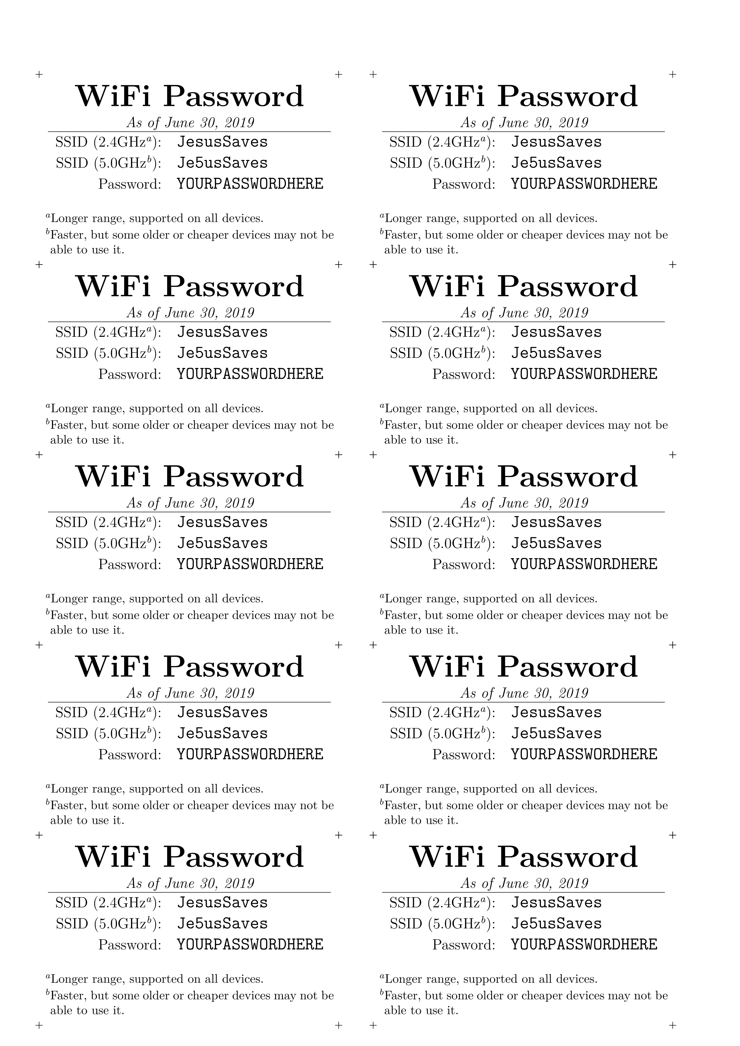 | \vcardfront{WiFi Password}{\today}{JesusSaves}{Je5usSaves}{{YOURPASSWORDHERE}}} | |