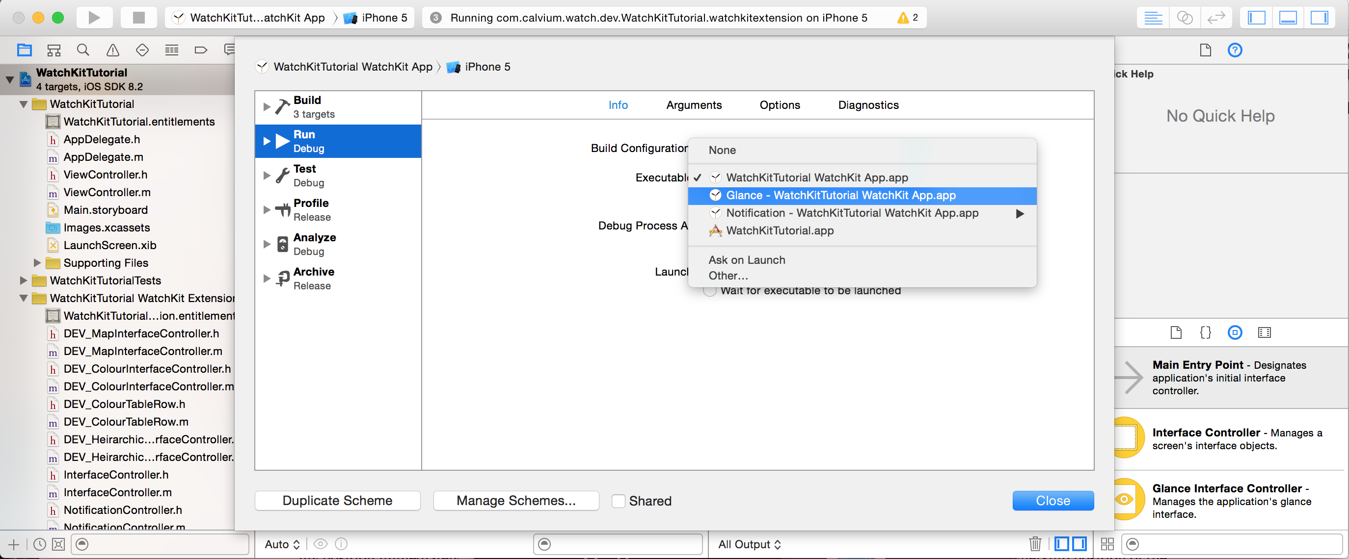 Firstly, we need to tell our emulator to run the "glances" mode and not the proper Apple Watch App. To do this click on the target for the emulator (bit to the left of which device your going to run on) and press edit scheme.