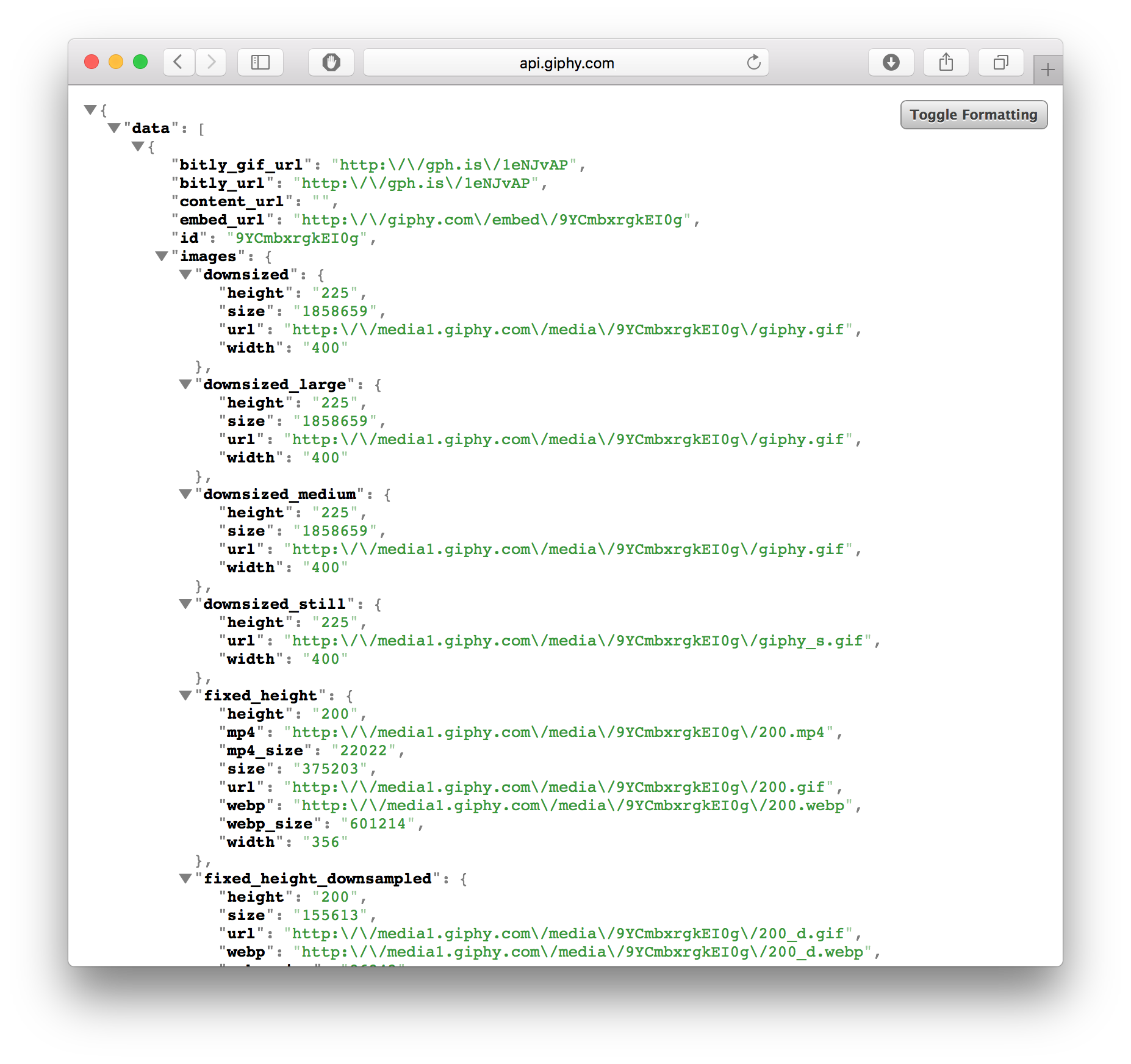 }We can really view JSON using any web browser - we'll be going through Giphy's API in a moment, but take a look at the url in a new window: