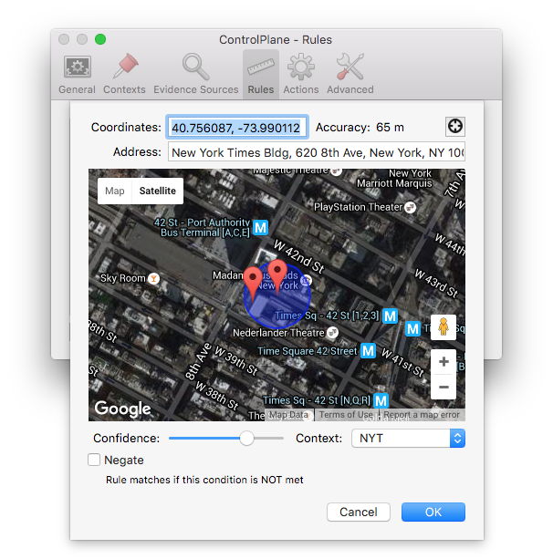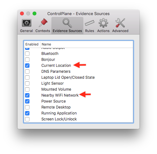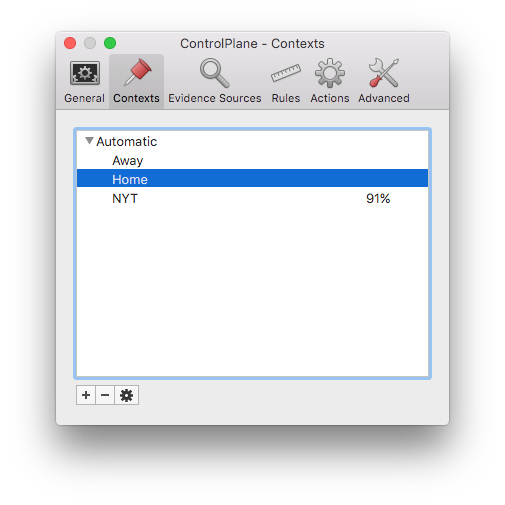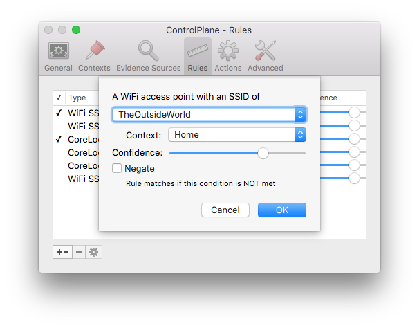 ControlPlane allows you to trigger actions based on contexts. Contexts are defined by system characteristics the app refers to as "evidence sources." The plan is to create a context that goes active when ControlPlane detects you are at home, based on CoreLocation and WiFi information.