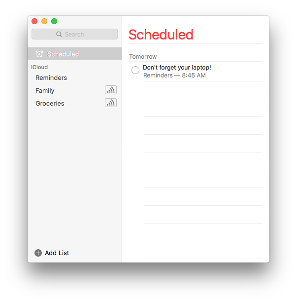 Next, modify the laptop_reminder.sh and laptop_reminder.applescript scripts below to use the correct iCloud reminder list and set the text and alert time of the generated reminder.