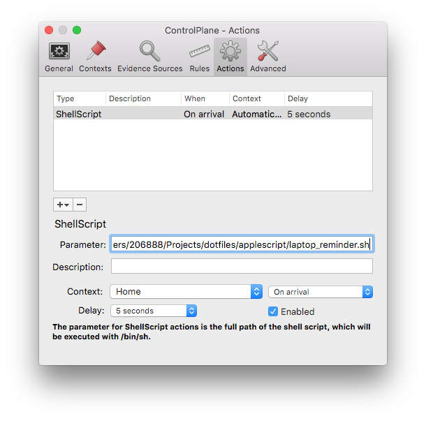 Finally, create an action that will trigger laptop_reminder.sh, which then calls laptop_reminder.applescript when the home context activates.