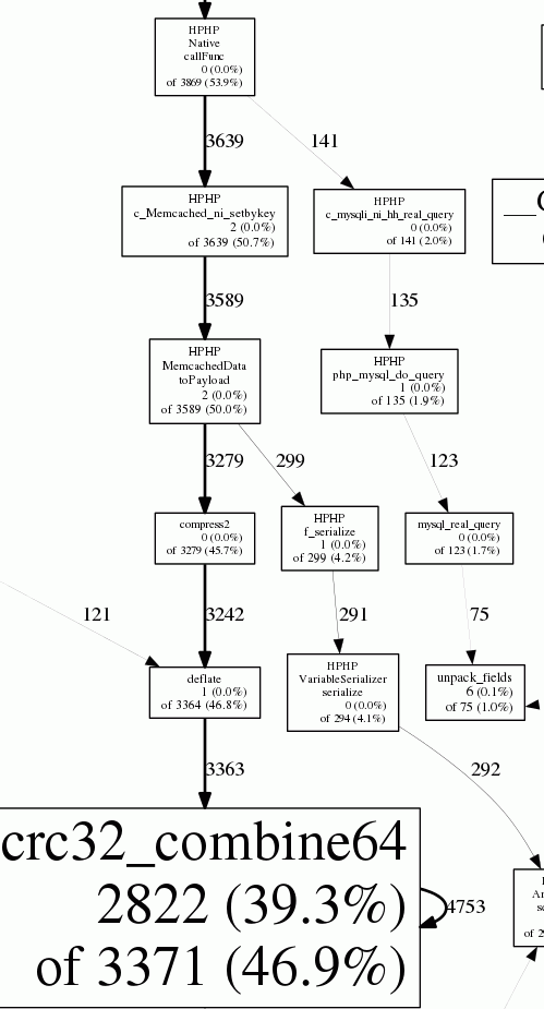 The most interesting tree is the one on the far left, particularly compress2 > deflate > crc32_combine64 calls that originate from MemcachedData::setByKey > MemcachedData::toPayload. To this moment I'm still not quite sure why they are so slow, maybe Simon Welsh can pitch in (the MemcachedData stuff seems related to HNI conversion). I compiled PHPNG and HHVM with the same zlib.