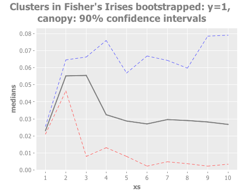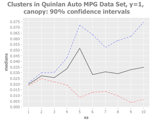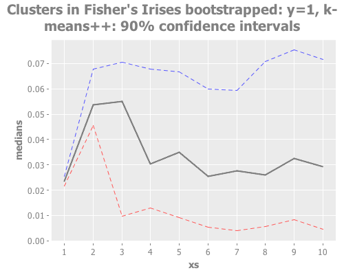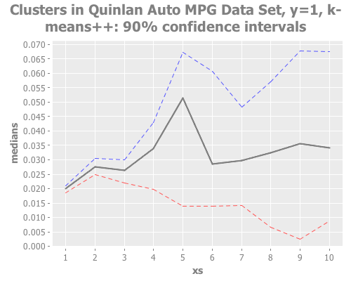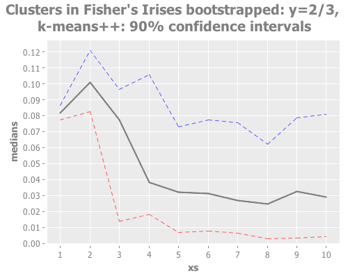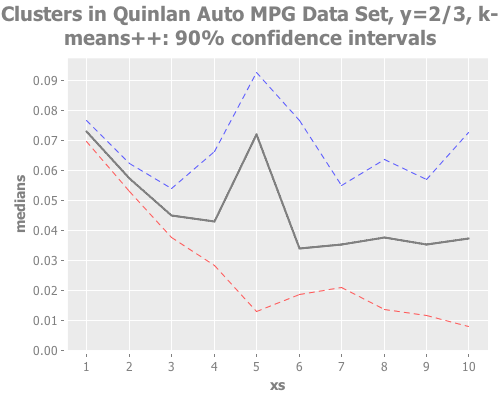 :upper-quantile 0.032739020120293484}}That gives us everything we need to plot our graph, which will use confidence intervals to illustrate where the majority of k-means runs landed. Now we need a function that draws confidence intervals, which is merely a wrapper around Incanter's xy-plot: