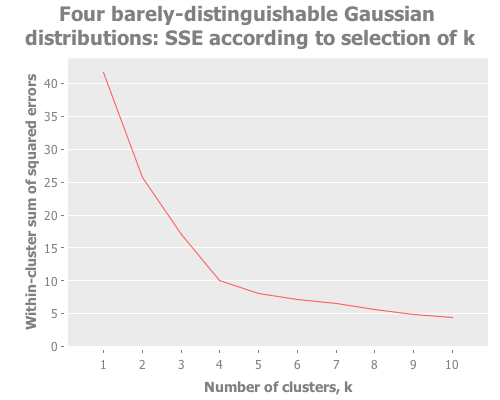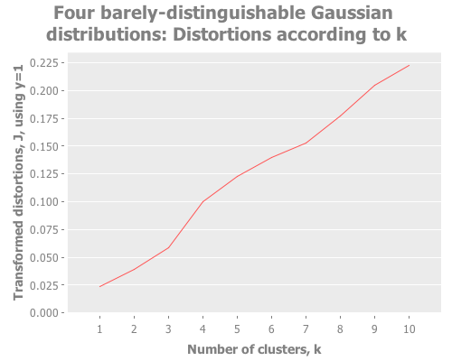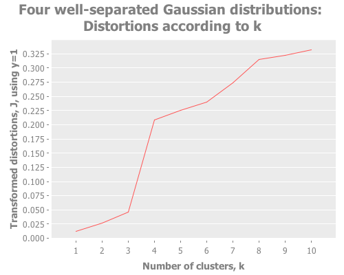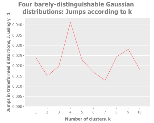 By now, we have the jump method, bootstraps, and confidence intervals both numeric and graphed each secured in our tool belt. That is to me the actualized promise of Sugar & James' method: running a large number of k-means clustering attempts across possible values of k, then both numerically and visually evaluating the jumps in distortion. One is able to fiddle with knobs like the transformation power and initialization method while maintaining relative confidence in each run, since each one consists of many clustering attempts. Notice, too, that the visualization and the numerical result buttress each other: the graph gives one a sense of the shape of the jump data, whereas calculating the maximum jump for X proportion of Y runs gives the sometimes-vague confidence interval visualization a concrete anchor.