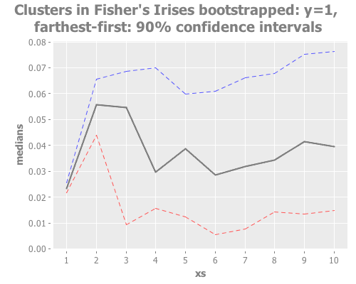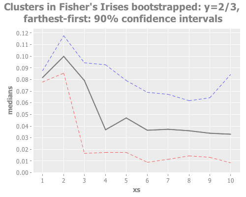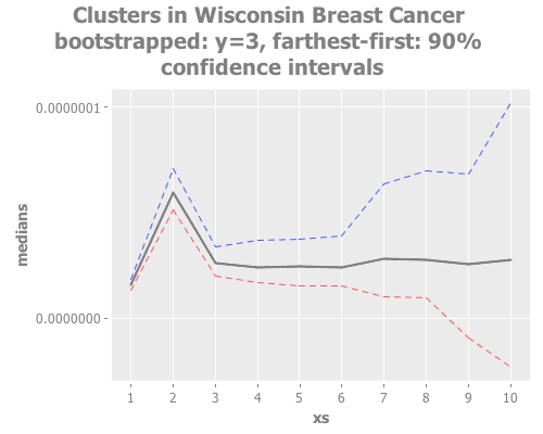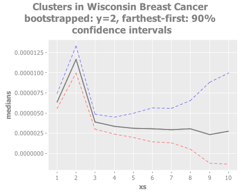 10 2 :farthest-first 100 wbcd-bootstrap [0.05 0.95])Using y=2 gives strong k=2 results across initialization methods, with great confidence. The results of trying y=3 agree: