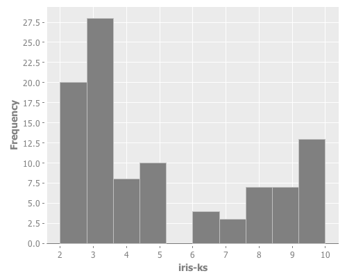 10 (/ 2 3) :k-means++ 100 iris-bootstrap [0.05 0.95])I get two major differences from Sugar & James results: a plateau between k=2 and k=3 instead of a peak at k=2 (when using y=1, at least), and a flagrantly wider confidence interval for k>=3. There are a number of possible causes for these differences, but generally speaking we're in the same ballpark. Notice as well that there is slight but not tremendous variation across the (non-random) initialization methods. That will not necessarily be true for all data sets.