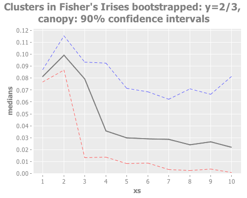 10 (/ 2 3) :farthest-first 100 iris-bootstrap [0.05 0.95])(graph-bootstrapped-jumps "Fisher's Irises bootstrapped: y=2/3, canopy"