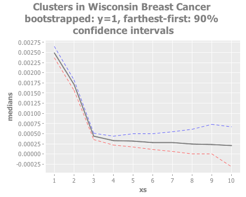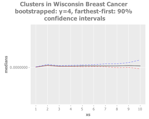 10 4 :farthest-first 100 wbcd-bootstrap [0.05 0.95])Using y=1, following the authors, tells us k=1 just as before: